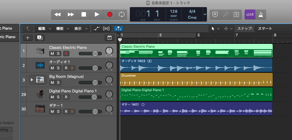 Logicに搭載されている音源や、自身でインストールした音源を使用して制作を開始します。今の「打ち込み」の作業イメージに一番近いかも。 - オーディオ