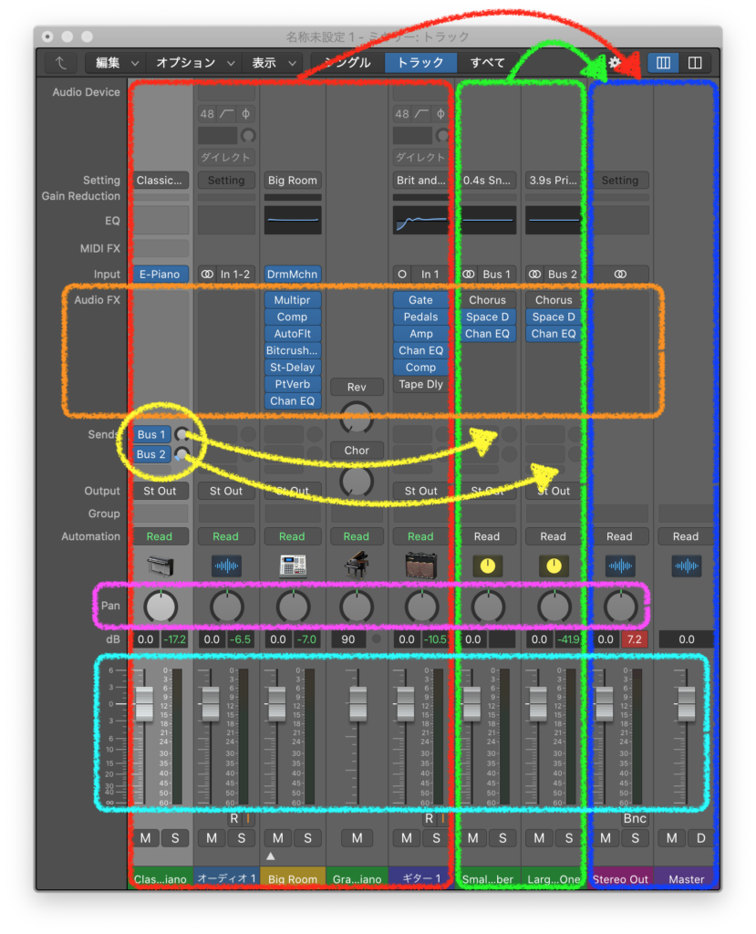 上記5段の中にはないトラックが並んでいます。これらはバスと呼ばれ、赤枠の中のトラックの音をこの中に送ることができます。